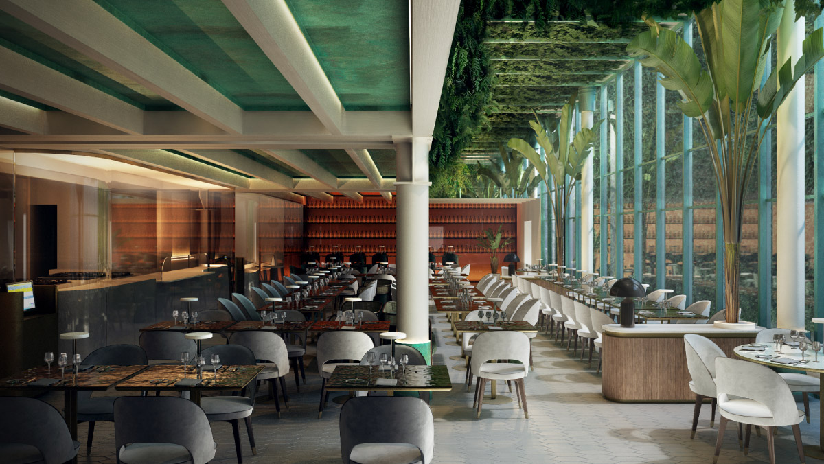 Le Linee minimali dei banchi verde salvia dialogano simbioticamente con le travi in legno a soffitto preesistenti nel pieno rispetto degli elementi caratterizzanti dell’isola.